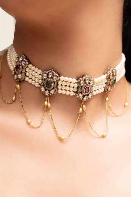 Intricate floral motifs with colored stone embellishments, Delicate gold chains with pearl accents