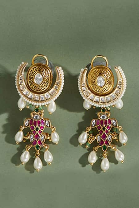 Gold Plated Pearls, Stones Ornate Crescent Kundan Polki Embellished Danglers