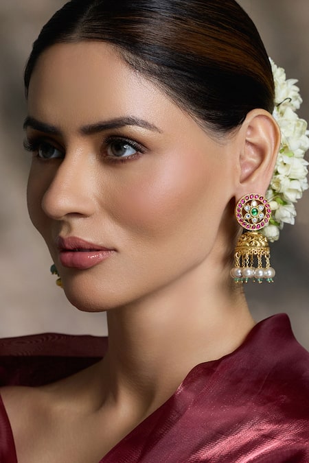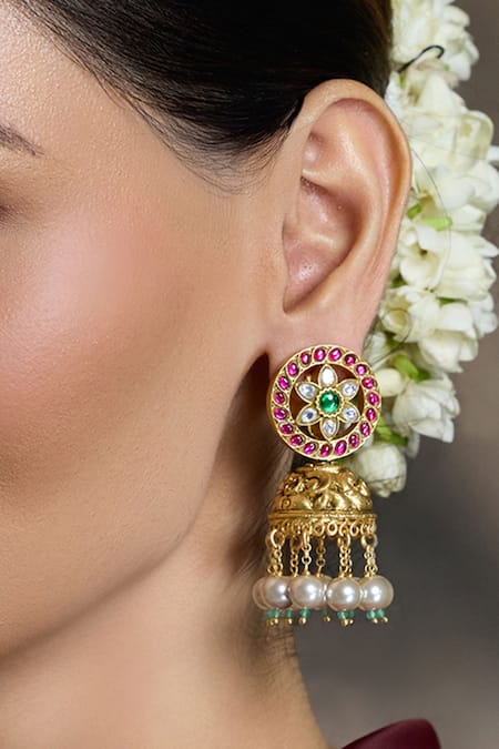 Circular stud with floral kundan & stone design, Intricate detailing on the jhumka bell, Multiple pearl and emerald bead drops