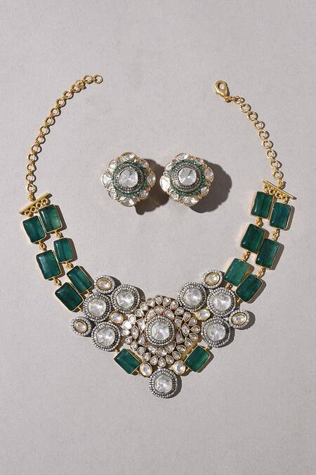 Green choker featuring hydro polkis, kundan, and agate beads with emerald embellishments. Paired with matching earrings adorned with similar embellishments.