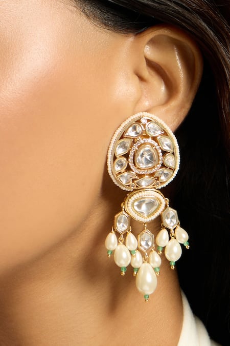 White earrings featuring gold finish with carved polki stones and pearl danglers