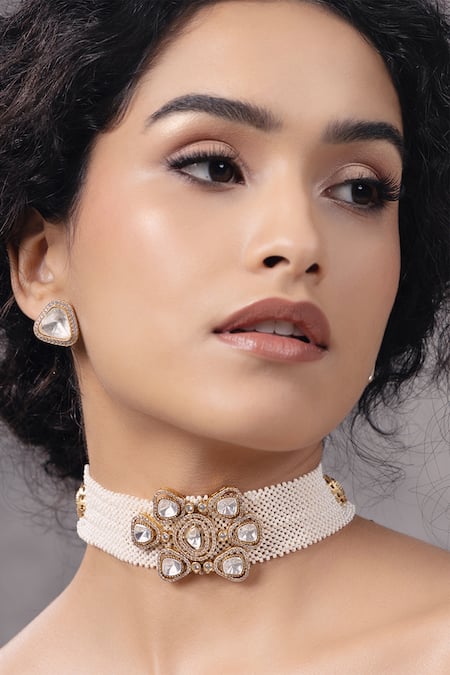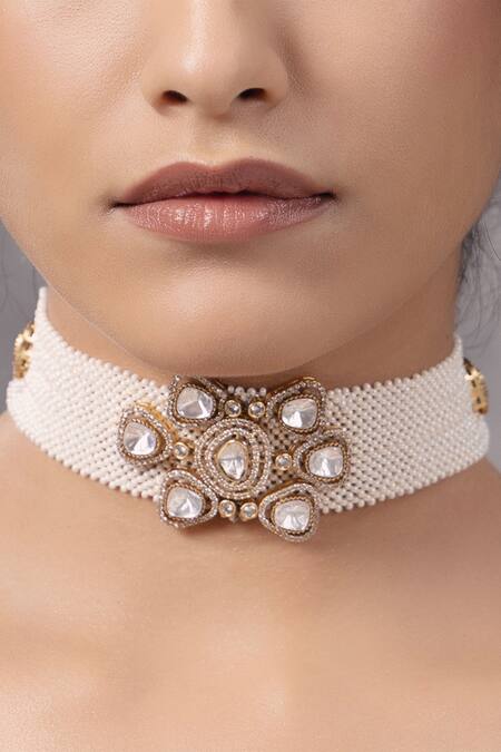 Gold choker necklace featuring a floral unit embellished with polki pearls and white stones