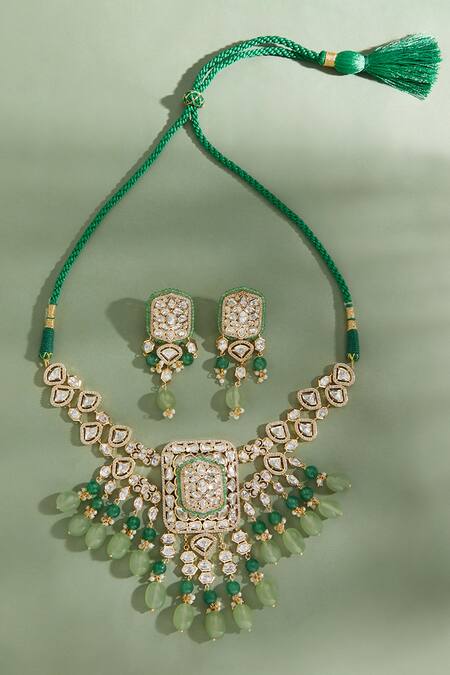 Green necklace set featuring hydro polkis, kundan, and agate round beads embellishment. Paired with matching earrings, both crafted from brass and 22kt gold plated.