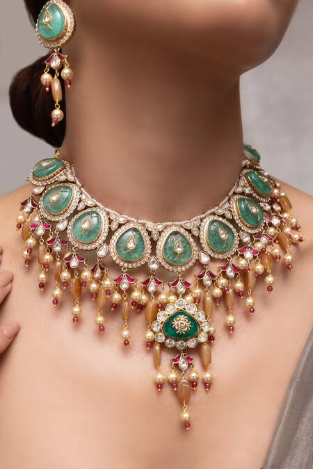 Intricate gold finish with pearl drops, Green stone embellishments, Floral design motifs on necklace