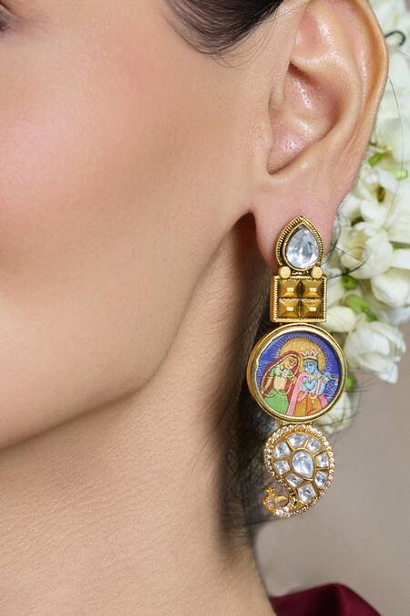 Brass drop earrings featuring traditional Rajasthani miniature art, Kundan stones, and an antique gold finish.