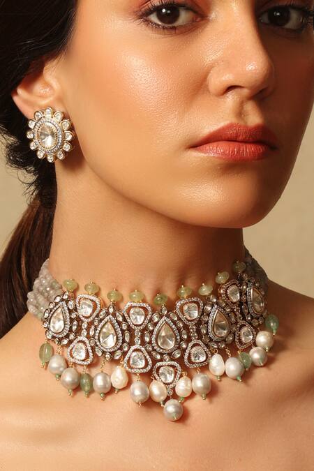 Buy_Joules By Radhika_Gray Beads, Stones And Pearl Embellished Necklace Set _at_Aza_Fashions