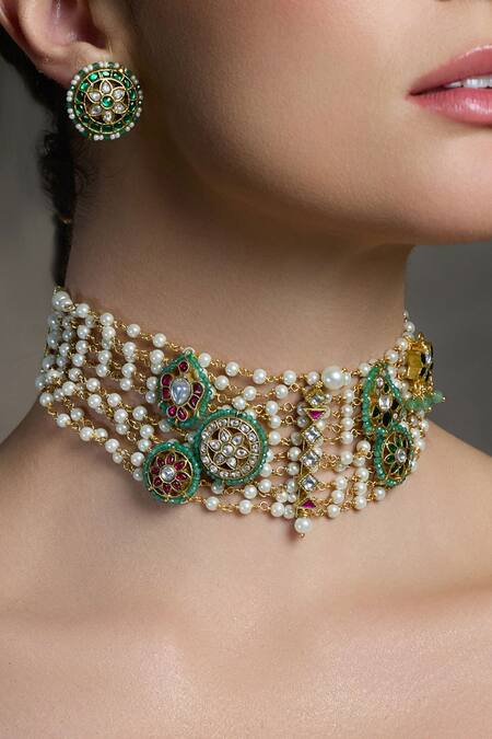 Multi-layered pearl strands, Intricate green-gold accents, Circular studded motifs