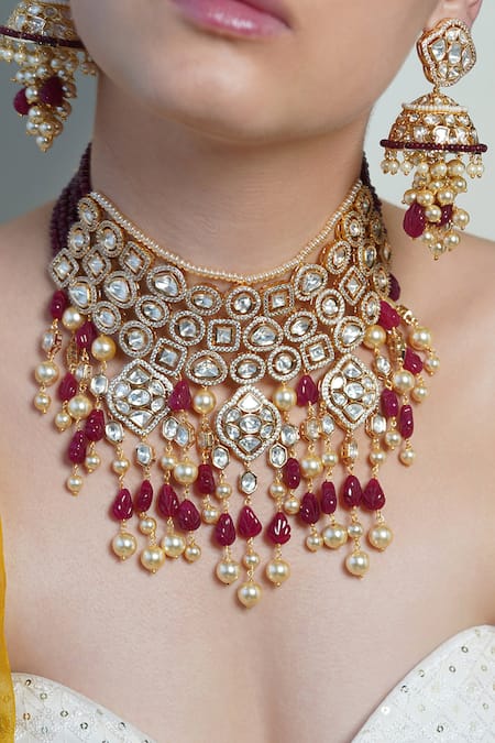 Multi-tiered kundan embellished choker design, Deep maroon ruby-like bead drops, Multiple strands of pearl drops