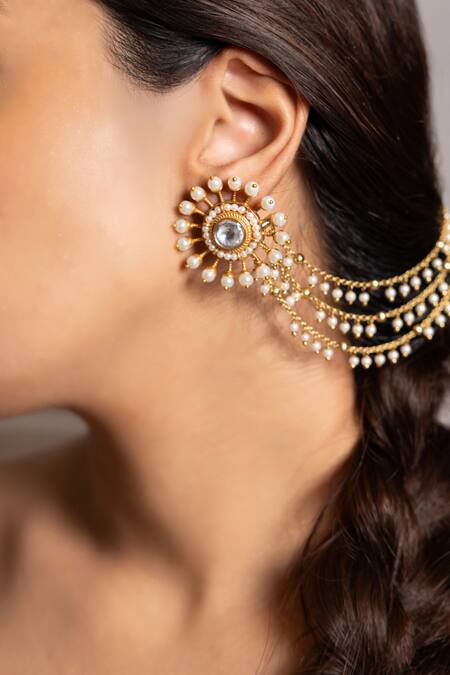 Designer earrings featuring a gold finish with intricate pearl embellishments