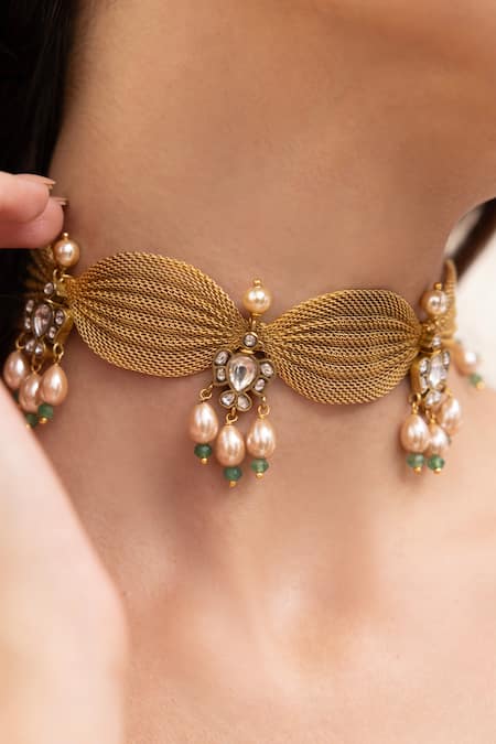Intricate leaf motifs with mesh detailing, Pearl and green stone embellishments, Adjustable fit for comfort