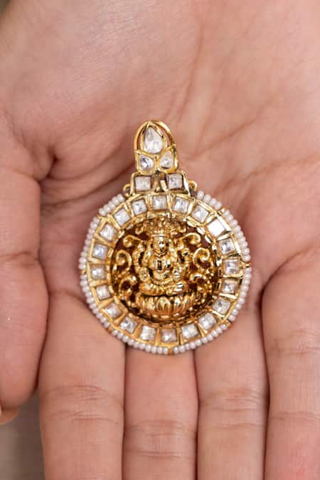 Intricate circular design with a central gold stone, Surrounded by sparkling embellishments, Gold finish plating for a luxurious look