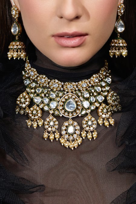 Gold Plated Stones, Pearls Sitara Siyahi Polki Embellished Bridal Necklace Set