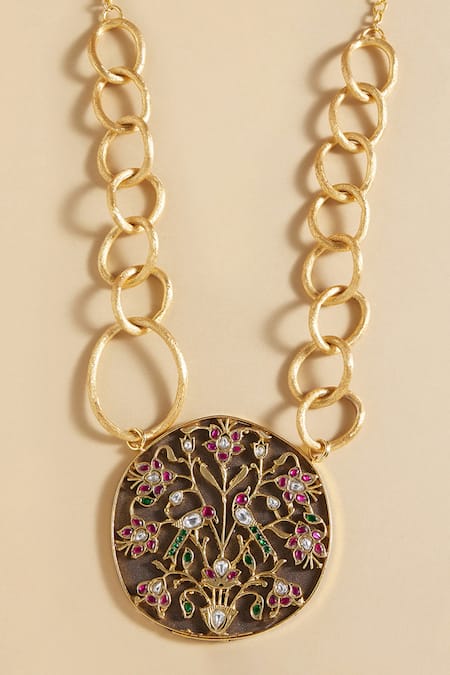 Gold chain link pendant necklace featuring a stone studded pendant with intricate designs