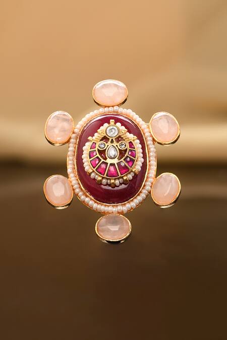 22kt gold plated ring featuring red agates, rose quartz, pearls, and kundan, polki embellishments