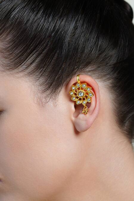 A brass ear cuff earring featuring a sculpted sunburst design with embedded gold colored stones.