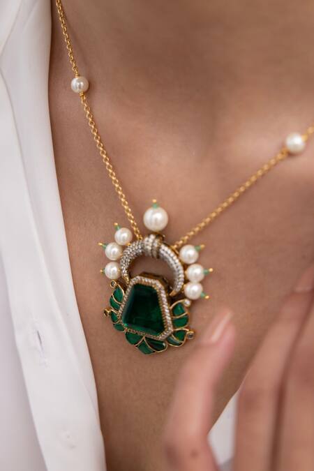 Intricate green stone centerpiece, Surrounded by pearl accents, Gold finish chain design