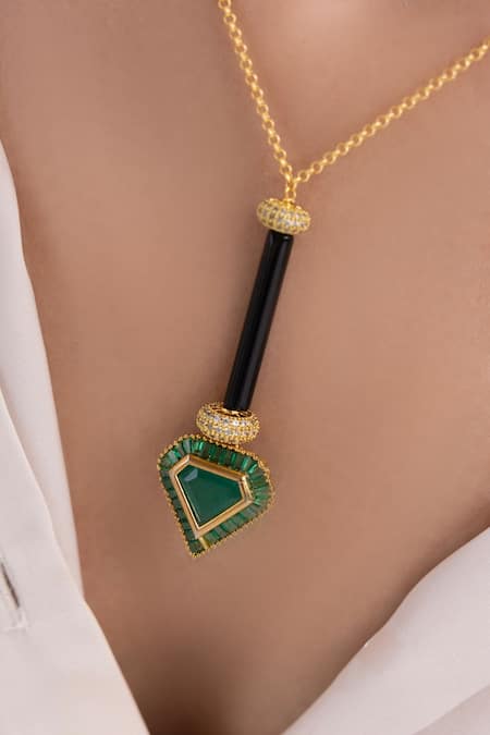 Intricate gold finish detailing around the stones, Black stone pendant with green accents, Lightweight design for comfortable wear