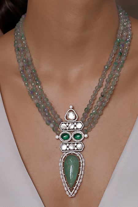Tear drop shaped pendant with intricate polki work, Multi-strand design with green stone accents