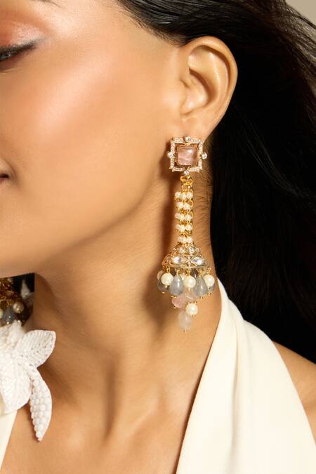 Gold finish jhumka style dangler earrings featuring kundan, stone, and pearl embellishments