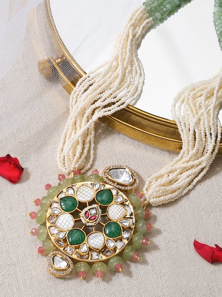 Gold finish with multi color toned beads, Intricate floral motif with various embellishments, Strung with multiple layers of pearls