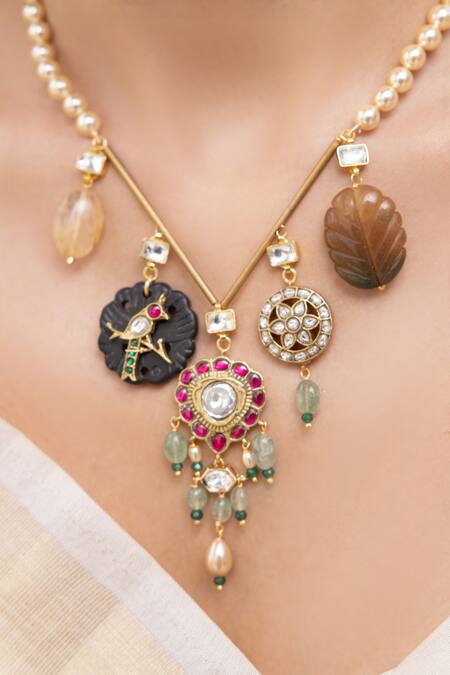 Intricate pendant with multicolor stones, Gold finish with pearl accents, Unique decorative elements including leaves and floral motifs