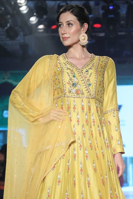 Buy_Joy Mitra_Yellow Chanderi Silk V-shaped Neckline Anarkali With Dupatta_at_Aza_Fashions