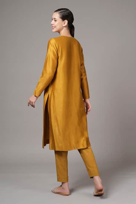 Yellow chanderi kurta featuring placement embroidery and a round neckline. Paired with matching pants for a complete look.