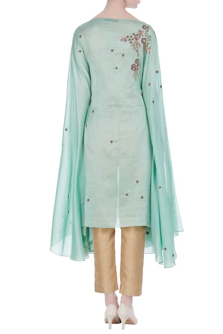 Glitzy and glamorous, this mint green tunic showcases long flared cut sleeves. It features sequin and moti embroidery. Team it up with gold-toned pants to complete the look.