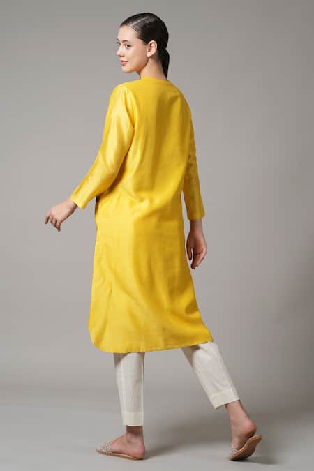 Yellow Chanderi kurta featuring placement floral vine embroidery and a buttoned placket. Paired with matching pants.