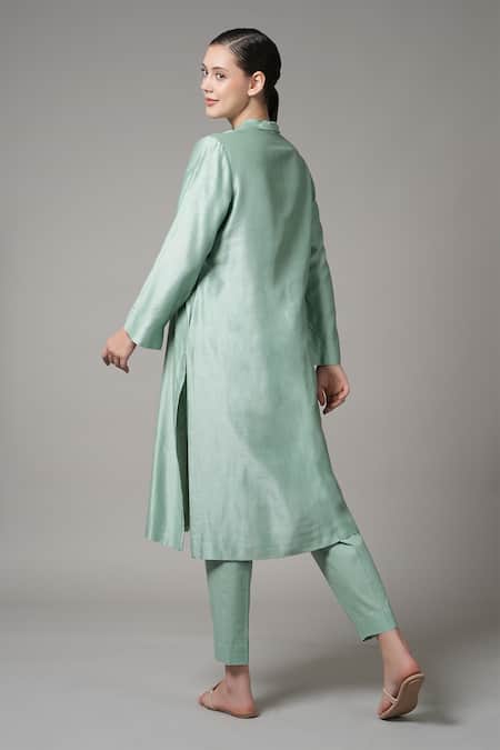 Green chanderi collared open front kurta featuring placement embroidery. Paired with matching pants for a coordinated look.