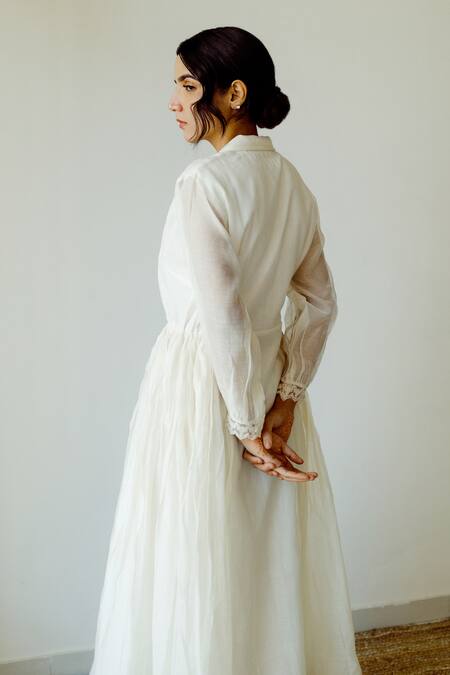 Ivory handwoven chanderi dress with jacket collar and side gathers.