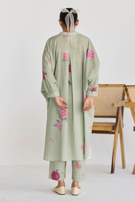 Green Cotton Embroidery Round Neck Dahlia Bloom Print Tunic With Pant