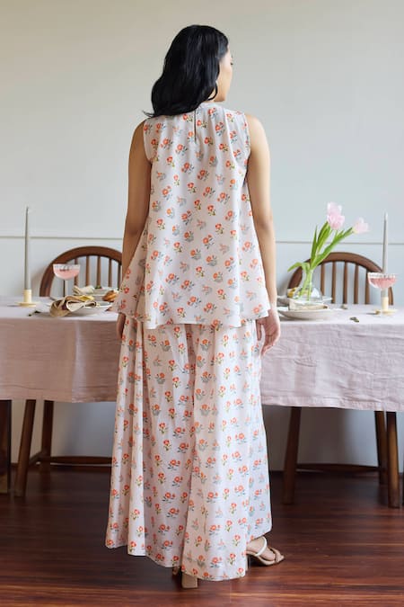 Beige floral printed tunic featuring a round neckline and sleeveless design. Paired with matching printed flared pants for a coordinated look.