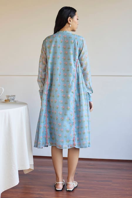 Blue Chanderi Round Neck Powder Bloom Print Midi Dress
