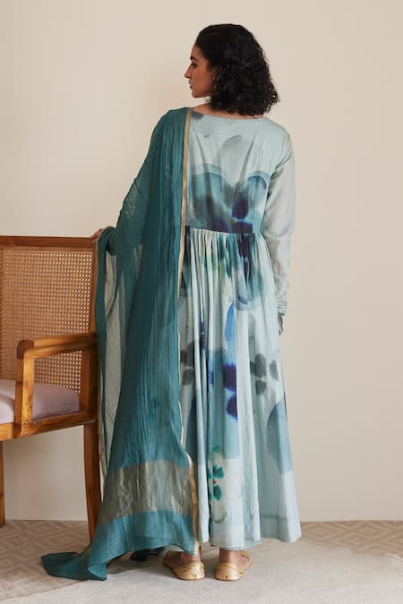 Blue & green long sleeves gathered flare cotton anarkali featuring an all-over watercolor bloom print. Paired with a cotton trouser and a zari border dupatta.