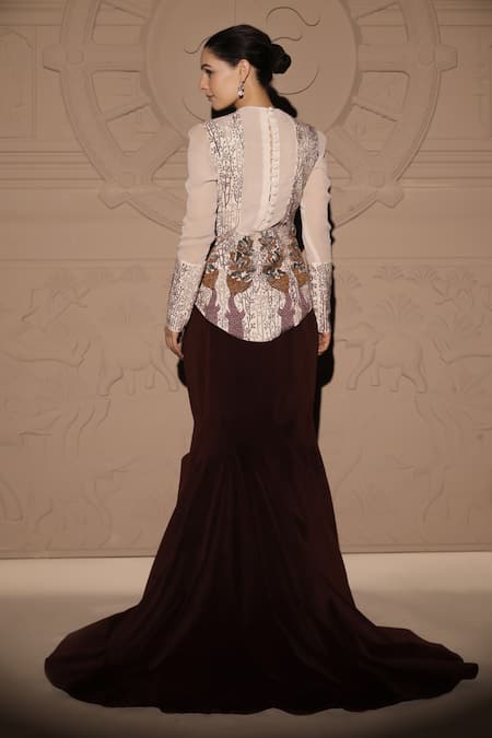 White asymmetric top featuring full sleeves and ambrosia beads embroidery. Paired with a maroon fish cut skirt in Italian velvet with an attached cancan and a trail at the back.