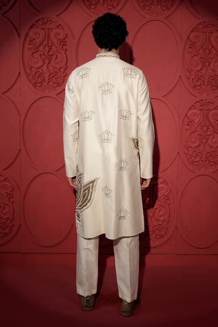 White chanderi kurta featuring gold sequins and pearls embroidered 3D lotus motifs. Paired with coordinating solid pant.