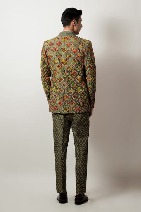 Crocodile green blazer style jacket featuring patchwork. Paired with textured beige kurta & zari embroidered pant.