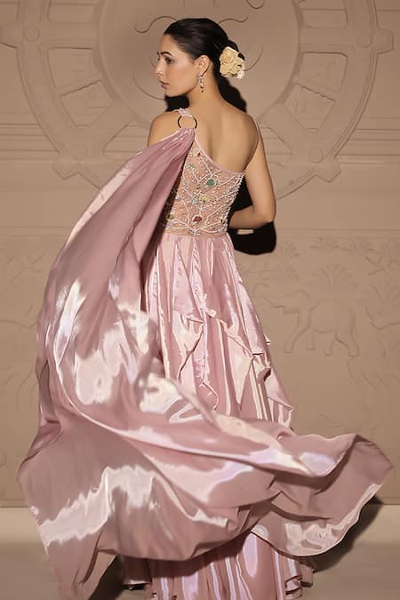 Pink Net, Organza Pearls, Beads One Shoulder Misty Lily Embellished Gown