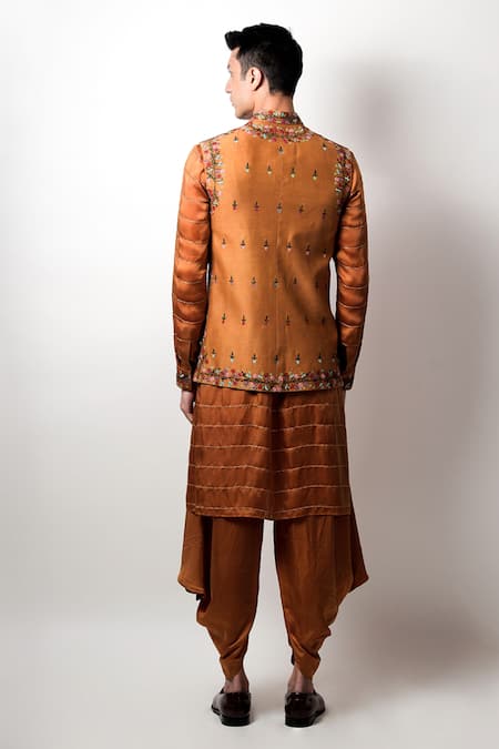 Mustard nehru jacket in silk chanderi base with all-over floral embroidered work.
