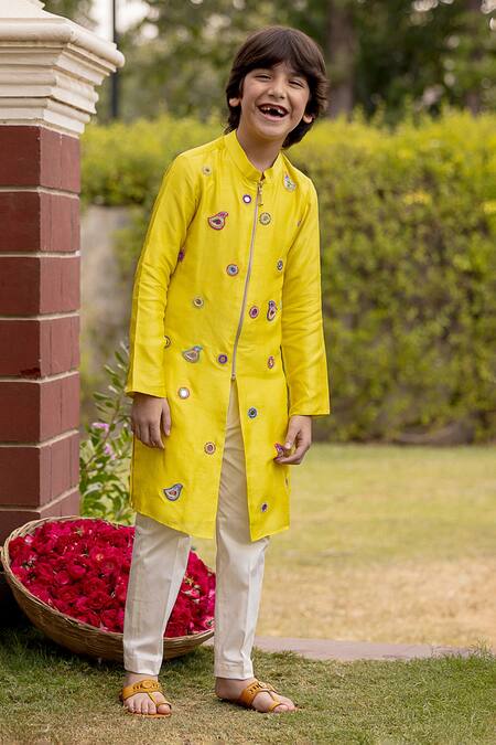 Green silk blend kurta featuring full sleeves and a mandarin collar with mirror and bead work. Paired with white cotton satin pants.