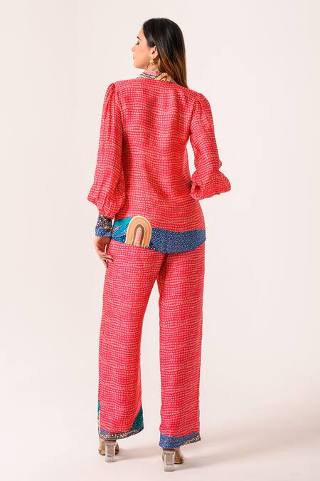 Pink Silk Satin Printed Abstract Collared Shirt And Pant Co-ord Set