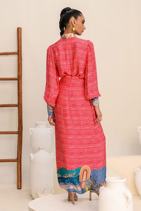 Maxi shirt featuring a collared neckline, balloon sleeves, and an abstract print. Paired with a matching draped skirt that complements the shirt design.