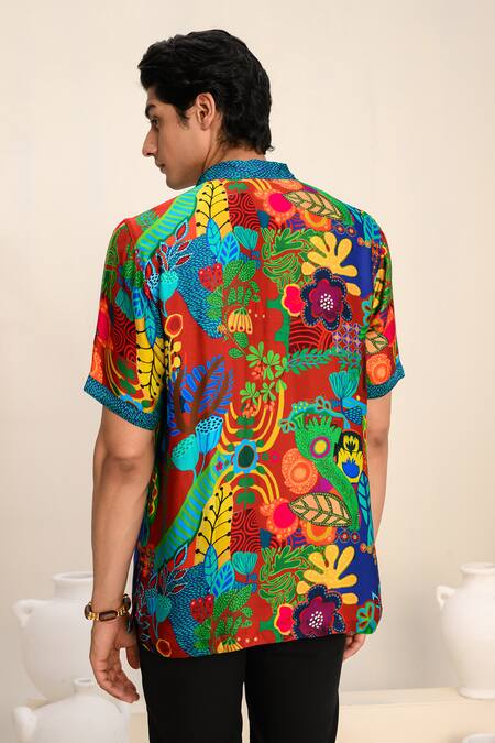 Multicolor shirt featuring a floral print with a collar and half sleeves. Paired with relaxed fit black trousers made from 100% terricotton.
