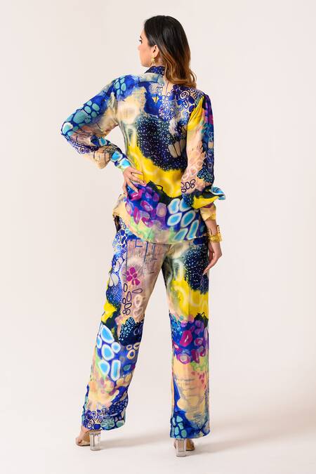 Multi Color Silk Satin Printed Galaxy Collar Indigoink Shirt And Pant Set