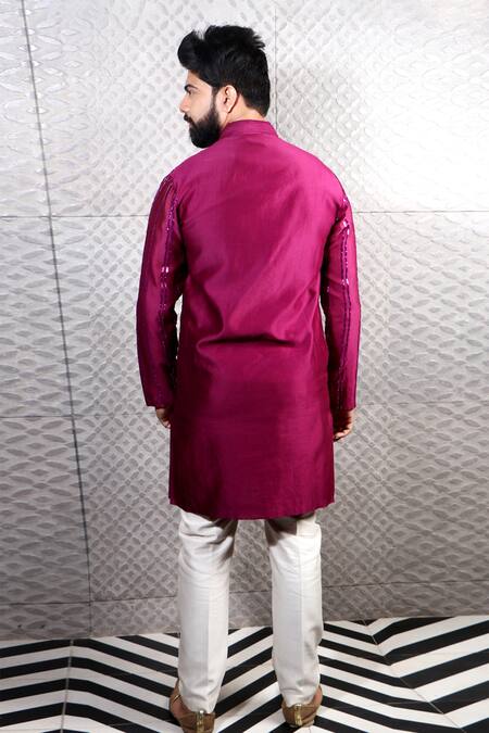 Wine kurta highlighted with geometric sequin embroidery, band collar & button placket.