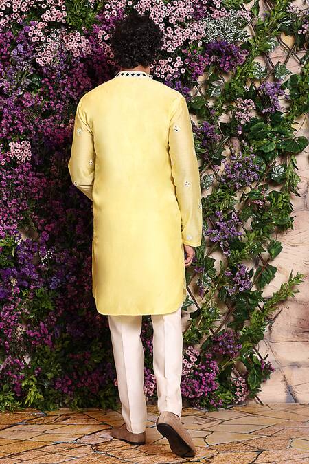 Illuminating yellow short kurta embroidered with mirrors and resham thread embroidery.