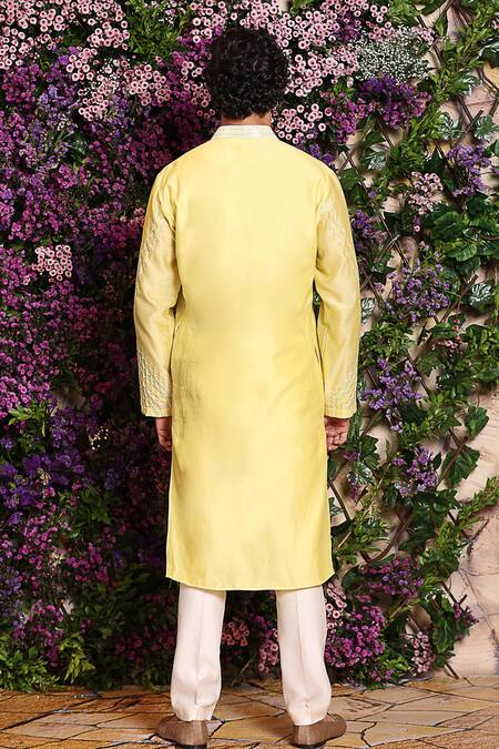 Front button placket, Shank buttons, Embroidered band collar and sleeves, Side slit kurta, Note:, Pant worn by the model is not for sale.