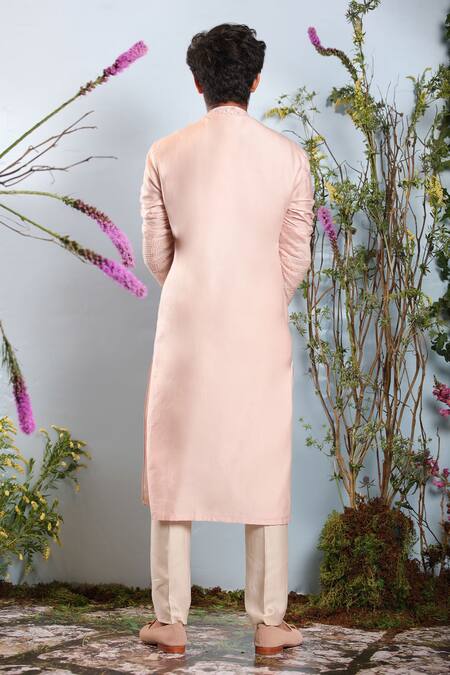 Pink chanderi kurta with floral embroidered on neckline & sleeve hem.