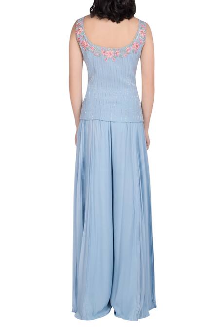 Blue Embroidery Embellished Top With Pleated Palazzos